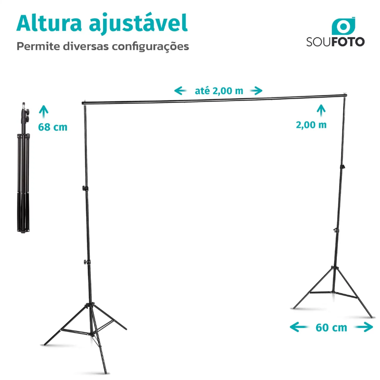 - Esse modelo de suporte é compatível com fundos de tecido que possuam até 2 metros de largura, deixando a altura a critério do usuário, uma vez que os tripés podem ajustar-se conforme a necessidade, até uma altura mínima de 81cm.